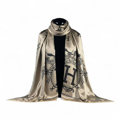 Expertly woven from a silk–wool blend, this scarf showcases the iconic Hermès carriage and “H” crest, symbolizing heritage and prestige.