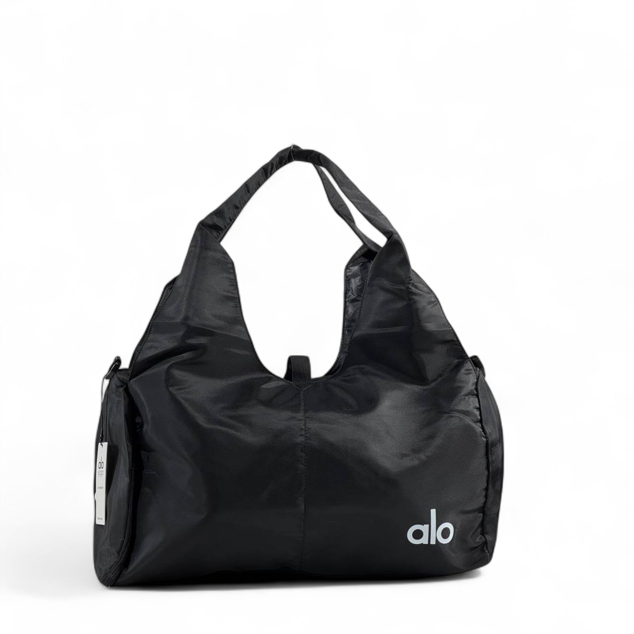 Crafted from lightweight, durable fabric, it offers a spacious main compartment, side pockets for quick access, and a removable shoulder strap for all-day comfort 🎒. The minimalist black design paired with the clean Alo logo makes it a timeless essential for any occasion.